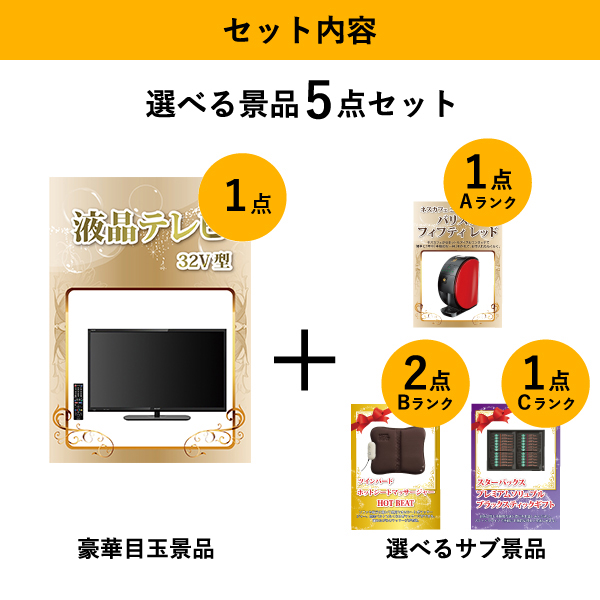 「32型液晶テレビ」をメイン景品とした、メイン景品1点と選べるサブ景品4点を合わせたセット!