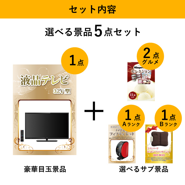 「32型液晶テレビ」をメイン景品とした、メイン景品1点と選べるサブ景品4点を合わせたセット!