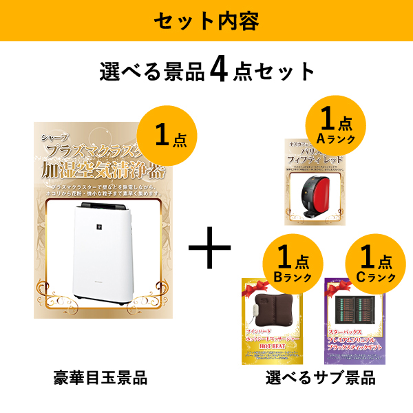 「シャープ 加湿空気清浄機」をメイン景品とした、メイン景品1点と選べるサブ景品3点を合わせたセット!