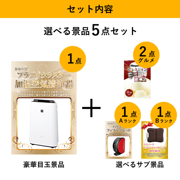 「シャープ 加湿空気清浄機」をメイン景品とした、メイン景品1点と選べるサブ景品4点を合わせたセット!