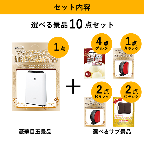 「シャープ 加湿空気清浄機」をメイン景品とした、メイン景品1点と選べるサブ景品9点を合わせたセット!