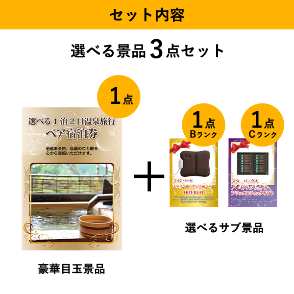 「選べる温泉旅行ペア宿泊券」をメイン景品とした、メイン景品1点と選べるサブ景品2点を合わせたセット!