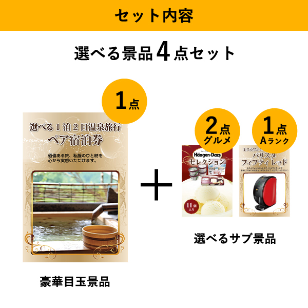 「選べる温泉旅行ペア宿泊券」をメイン景品とした、メイン景品1点と選べるサブ景品3点を合わせたセット!