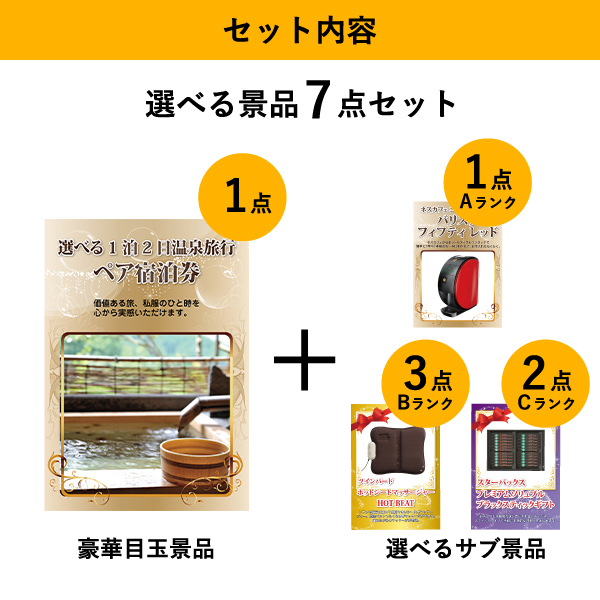 「選べる温泉旅行ペア宿泊券」をメイン景品とした、メイン景品1点と選べるサブ景品6点を合わせたセット!