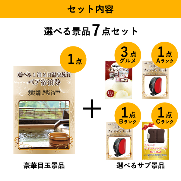 「選べる温泉旅行ペア宿泊券」をメイン景品とした、メイン景品1点と選べるサブ景品6点を合わせたセット!
