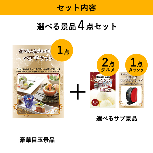 「選べる人気の高級レストランペアチケット」をメイン景品とした、メイン景品1点と選べるサブ景品3点を合わせたセット!