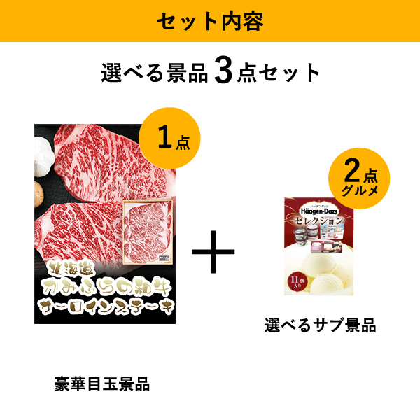 「北海道かみふらの和牛サーロインステーキ」をメイン景品とした、メイン景品1点と選べるサブ景品2点を合わせたセット!