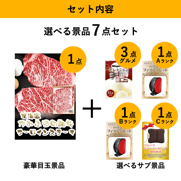 「北海道かみふらの和牛サーロインステーキ」をメイン景品とした、メイン景品1点と選べるサブ景品6点を合わせたセット!
