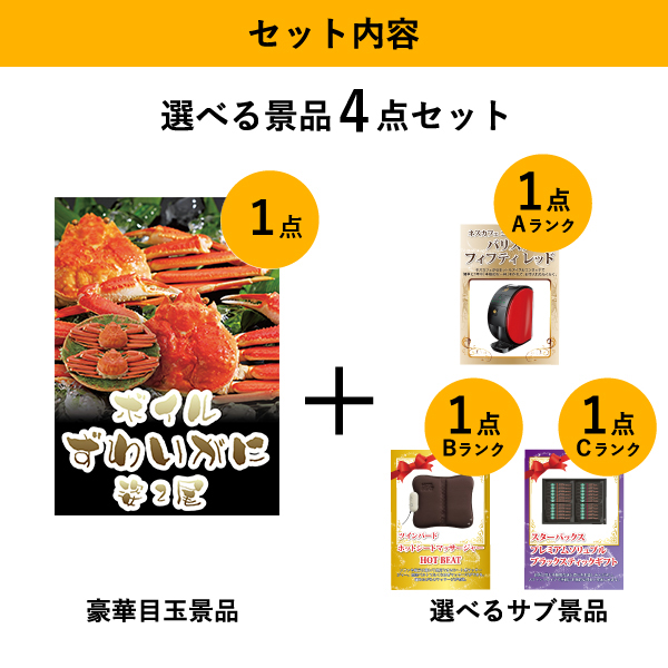 「ボイルずわいがに姿2尾」をメイン景品とした、メイン景品1点と選べるサブ景品3点を合わせたセット!