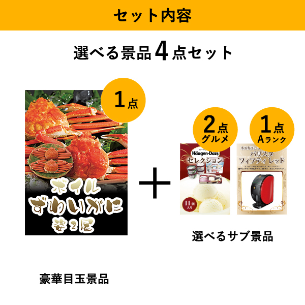 「ボイルずわいがに姿2尾」をメイン景品とした、メイン景品1点と選べるサブ景品3点を合わせたセット!