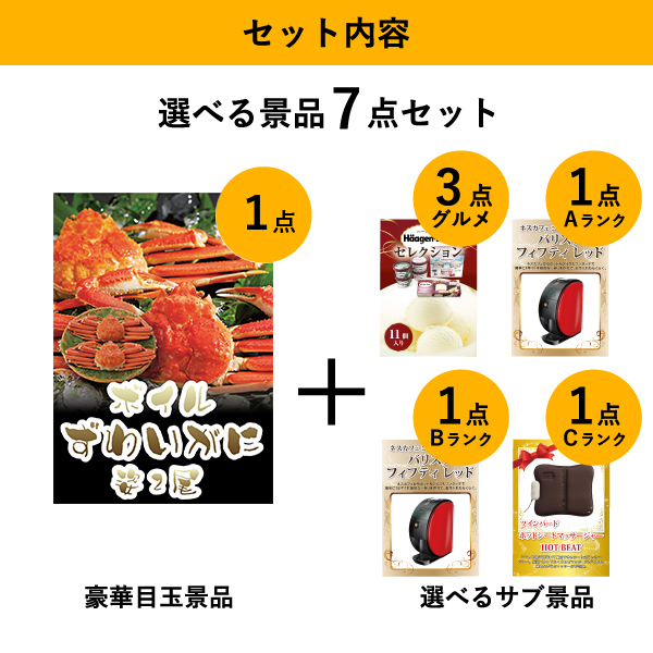 「ボイルずわいがに姿2尾」をメイン景品とした、メイン景品1点と選べるサブ景品6点を合わせたセット!
