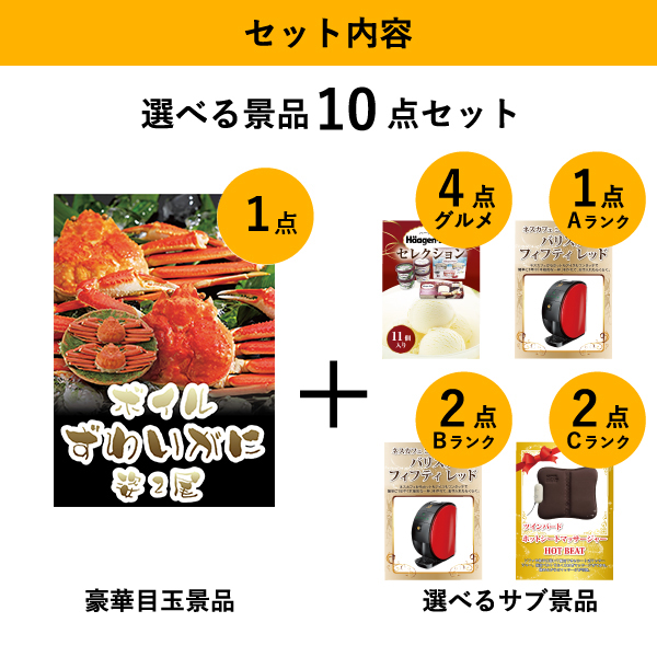 「ボイルずわいがに姿2尾」をメイン景品とした、メイン景品1点と選べるサブ景品9点を合わせたセット!