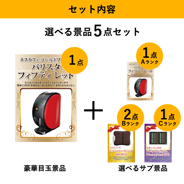 「ネスカフェ ゴールドブレンド バリスタ フィフティ レッド」をメイン景品とした、メイン景品1点と選べるサブ景品4点を合わせたセット!
