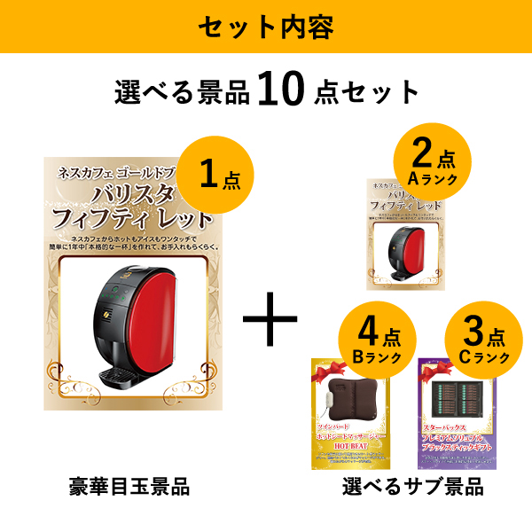 「ネスカフェ ゴールドブレンド バリスタ フィフティ レッド」をメイン景品とした、メイン景品1点と選べるサブ景品9点を合わせたセット!