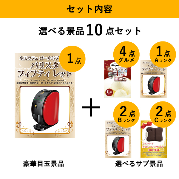 「ネスカフェ ゴールドブレンド バリスタ フィフティ レッド」をメイン景品とした、メイン景品1点と選べるサブ景品9点を合わせたセット!