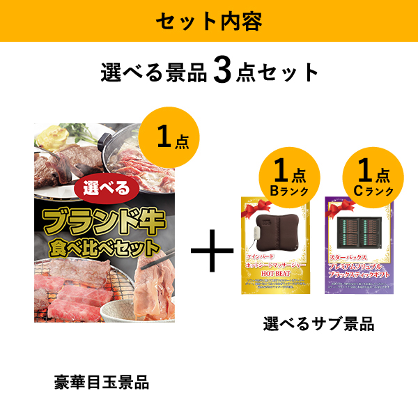 「選べるブランド牛 食べ比べセット」をメイン景品とした、メイン景品1点と選べるサブ景品2点を合わせたセット!