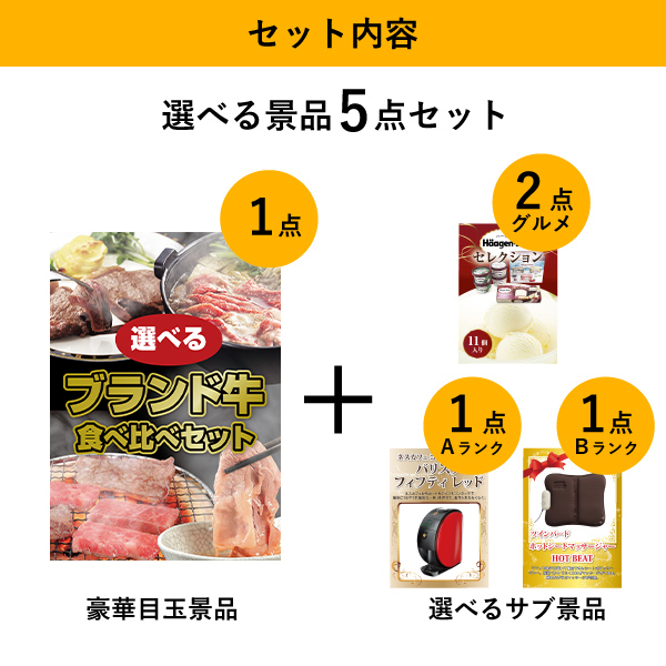 「選べるブランド牛 食べ比べセット」をメイン景品とした、メイン景品1点と選べるサブ景品4点を合わせたセット!