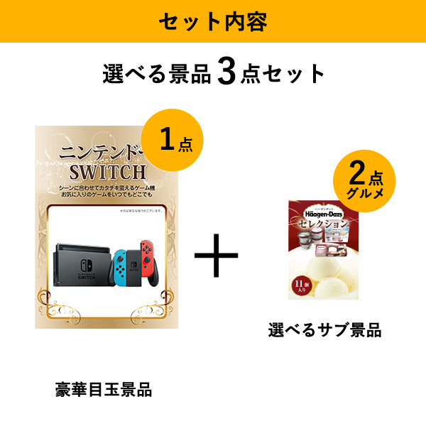 「ニンテンドーSWITCH」をメイン景品とした、メイン景品1点と選べるサブ景品2点を合わせたセット!