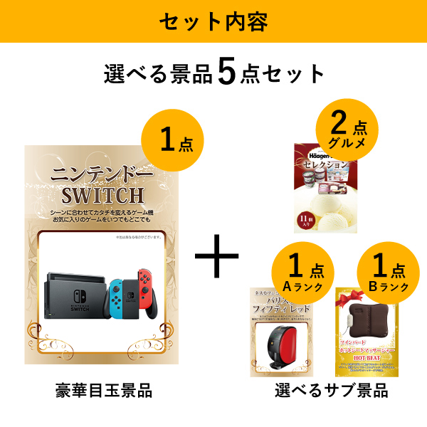 「ニンテンドーSWITCH」をメイン景品とした、メイン景品1点と選べるサブ景品4点を合わせたセット!