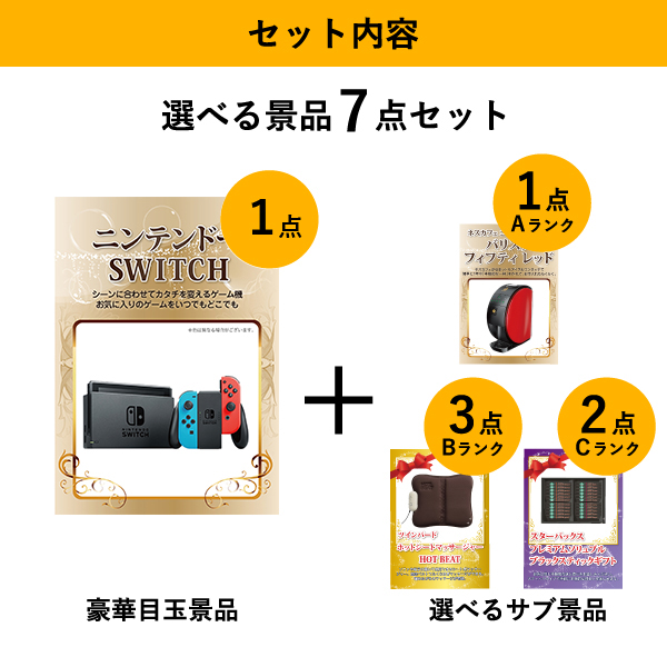「ニンテンドーSWITCH」をメイン景品とした、メイン景品1点と選べるサブ景品6点を合わせたセット!