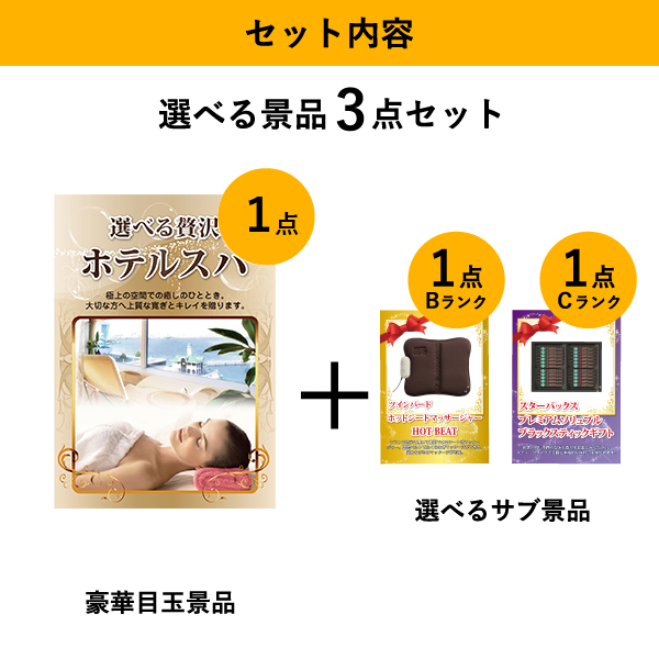 「選べる贅沢ホテルスパ」をメイン景品とした、メイン景品1点と選べるサブ景品2点を合わせたセット!