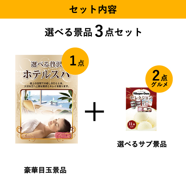 「選べる贅沢ホテルスパ」をメイン景品とした、メイン景品1点と選べるサブ景品2点を合わせたセット!