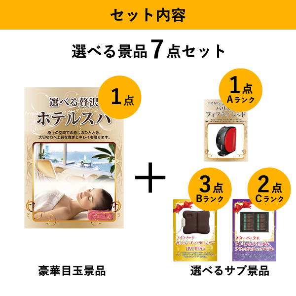 「選べる贅沢ホテルスパ」をメイン景品とした、メイン景品1点と選べるサブ景品6点を合わせたセット!