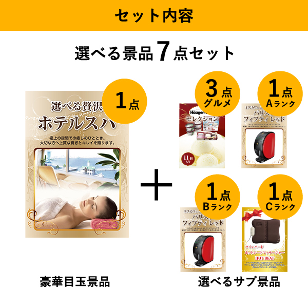 「選べる贅沢ホテルスパ」をメイン景品とした、メイン景品1点と選べるサブ景品6点を合わせたセット!