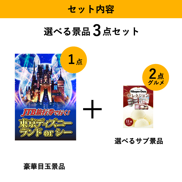 「JTB旅行券(2万円分)で行こう ディズニーランドorシー」をメイン景品とした、メイン景品1点と選べるサブ景品2点を合わせたセット!