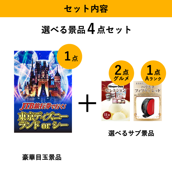 「JTB旅行券(2万円分)で行こう ディズニーランドorシー」をメイン景品とした、メイン景品1点と選べるサブ景品3点を合わせたセット!