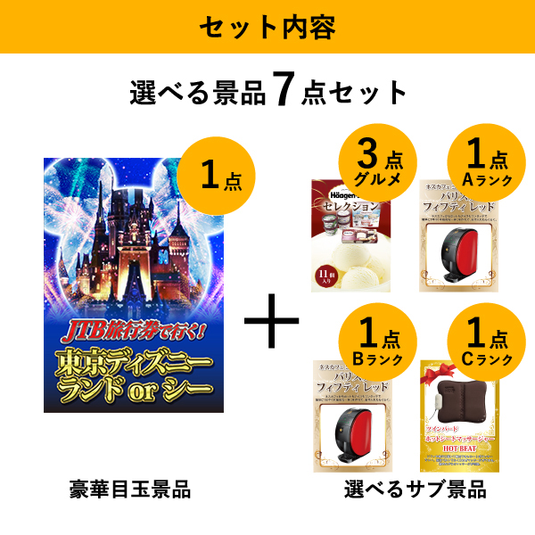 「JTB旅行券(2万円分)で行こう ディズニーランドorシー」をメイン景品とした、メイン景品1点と選べるサブ景品6点を合わせたセット!