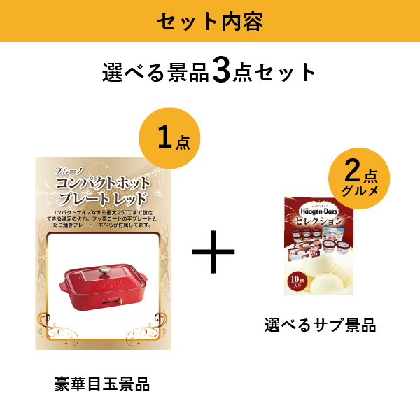 「BRUNO コンパクトホットプレート」をメイン景品とした、メイン景品1点と選べるサブ景品2点を合わせたセット!