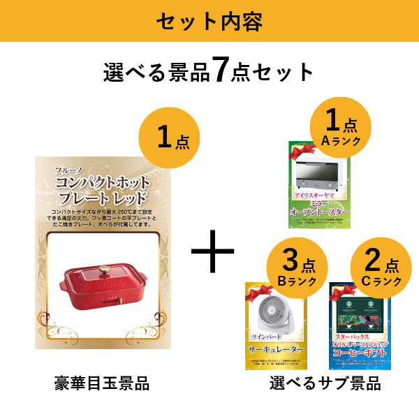 「BRUNO コンパクトホットプレート」をメイン景品とした、メイン景品1点と選べるサブ景品6点を合わせたセット!