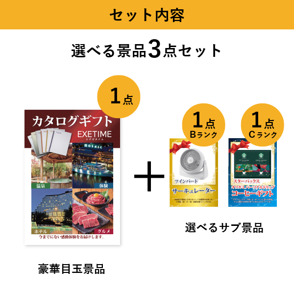 「選べるリゾートホテル・ナイトクルーズ」をメイン景品とした、メイン景品1点と選べるサブ景品2点を合わせたセット!