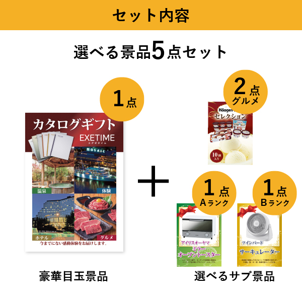 「選べるリゾートホテル・ナイトクルーズ」をメイン景品とした、メイン景品1点と選べるサブ景品4点を合わせたセット!