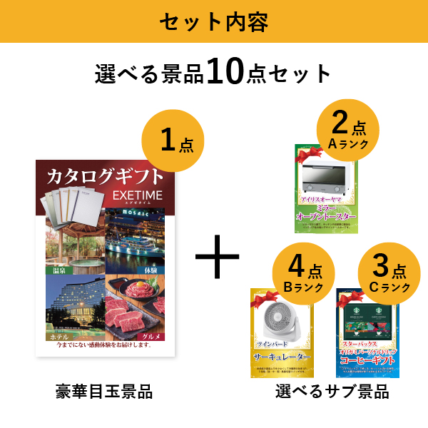 「選べるリゾートホテル・ナイトクルーズ」をメイン景品とした、メイン景品1点と選べるサブ景品9点を合わせたセット!