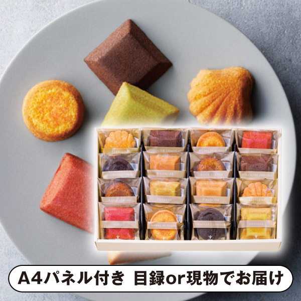 | 内容 | メープルアーモンドケーキ・いちごバターケーキ・チョコオレンジケーキ・マドレーヌ・フィナンシェピスタチオ・りんごバターケーキ・フィナンシェ・フィナンシェショコラ×各2 A4パネル×1 |