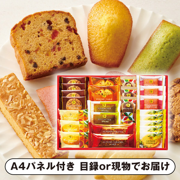 | 内容 | オレンジマドレーヌ・ストロベリーショコラケーキ・ブラウニー×各3、ピスタチオフィナンシェ・ブラウンシュガーパウンドケーキ・アーモンドキャラメルケーキ×各2、チョコチップクッキー×4、レモンクッキー×5 A4パネル×1 |