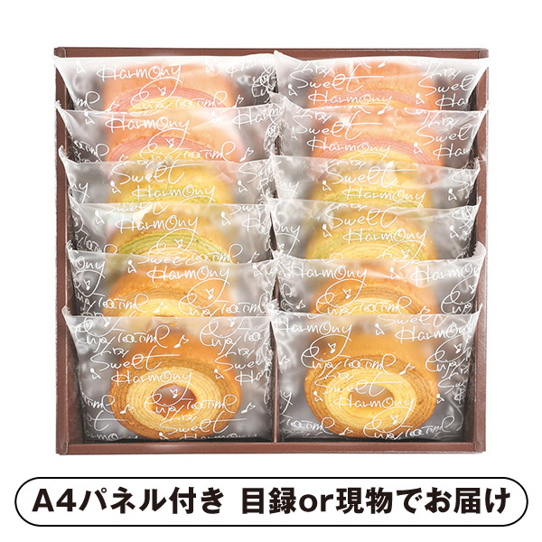 | 内容 | 2層バームクーヘン(キャラメル&ミルク・ストロベリー&ミルク・抹茶&ミルク)(30g)×各4 A4パネル×1 |