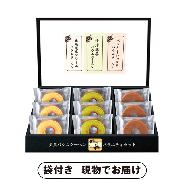 | 内容 | ミニバウムクーヘン(北海道生クリーム・宇治抹茶・ベルギーショコラ)×各3 |