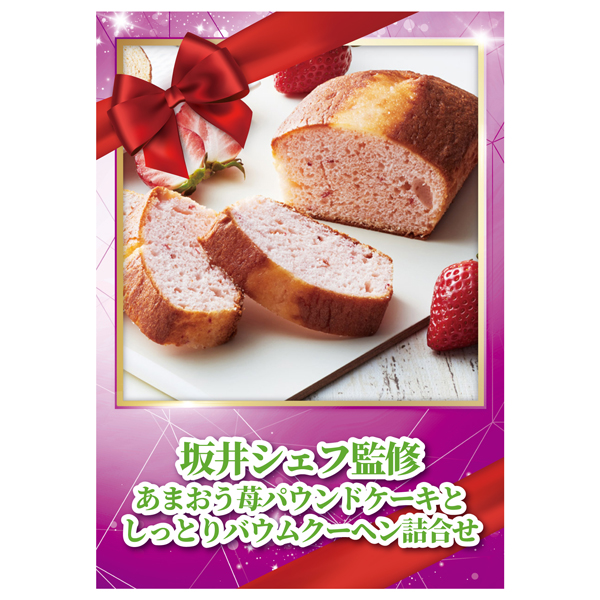 | 内容 | あまおう苺パウンドケーキ・バウムクーヘン(バニラ)・バニラクッキー(30g箱入)・チョコクッキー(30g箱入)×各1、バウムクーヘン(ココア)×2 A4パネル×1 |