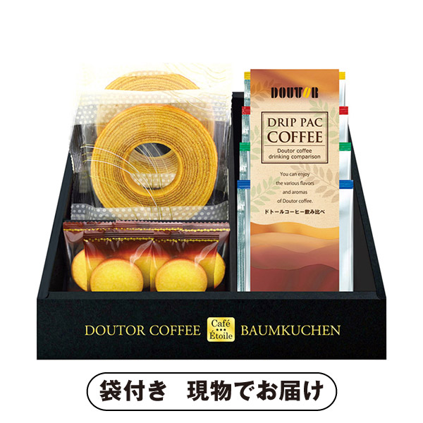 | 内容 | ミルクバウムクーヘン×2、プレーンクッキー×5、ドトールドリップコーヒー(深煎りブレンド・キリマンジャロブレンド・モカドブレンド・アロマブレンド)(7g)×各1 |