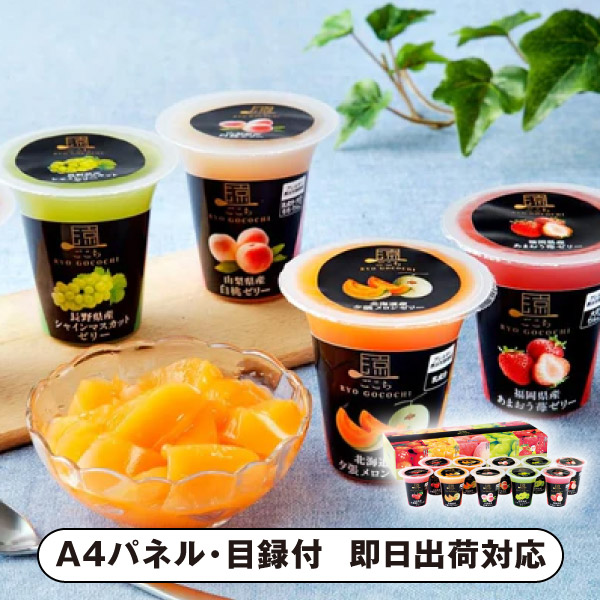 | 内容 | 北海道産夕張メロンゼリー(125g)・福岡県産あまおう苺ゼリー(125g)・山梨県産白桃ゼリー(125g)・長野県産シャインマスカットゼリー(125g)・山形県産佐藤錦さくらんぼゼリー(125g)×各2 A4パネル×1 |