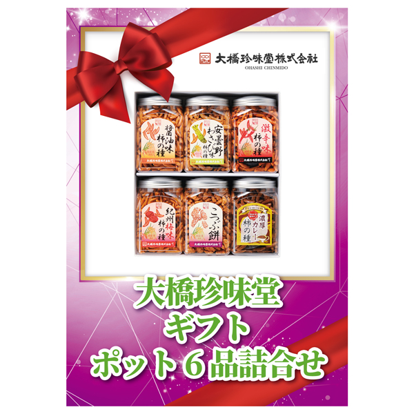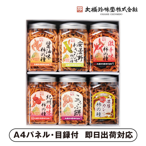 | 内容 | ポット柿の種(210g)・ポット柿の種安曇野産山葵味(210g)・ポット柿の種激辛味(200g)・ポット濃厚カレー柿の種(200g)・ポット柿の種紀州産梅味(210g)・ポットこつぶ餅(200g)×各1 A4パネル×1 |