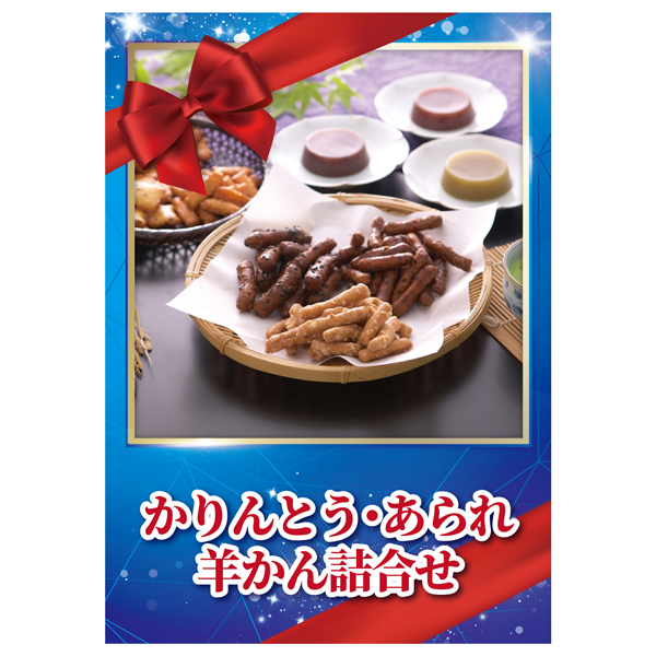 | 内容 | 蜂蜜黒糖かりんとう(40g)・羊かん(抹茶・練り)(60g)×各1、あられ(海老)(12g)×3、あられ(海苔)(12g)・あられ(味噌)(12g)×各2 A4パネル×1 |