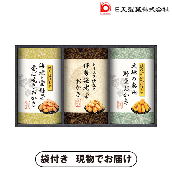 | 内容 | トリュフ仕立て伊勢海老風味おかき(40g)・焼き塩仕立て海老と雲丹風味香ば焼きおかき(40g)・淡路ローストオニオン仕立て大地の恵み野菜おかき(40g)×各1 |