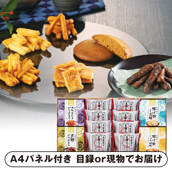 | 内容 | 黒糖丸ぼうろ×8、揚げ餅(しお味・しょうゆ味)20g・かりんとう(さつまいも・黒糖)40g×各1 A4パネル×1 |