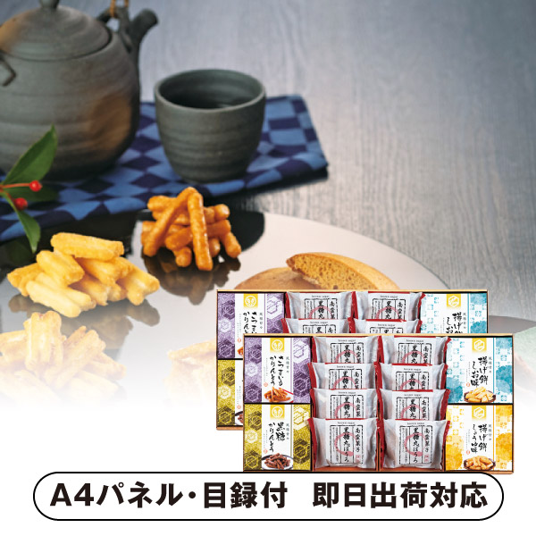 | 内容 | 黒糖丸ぼうろ×16、揚げ餅(しお味・しょうゆ味)20g・かりんとう(さつまいも・黒糖)40g×各2 A4パネル×1 |