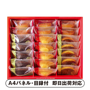 内容 | マドレーヌ・マドレーヌ ショコラ・アマンディーヌ 各5個、フィナンシェ6個 計21個入 A4パネル×1 |
