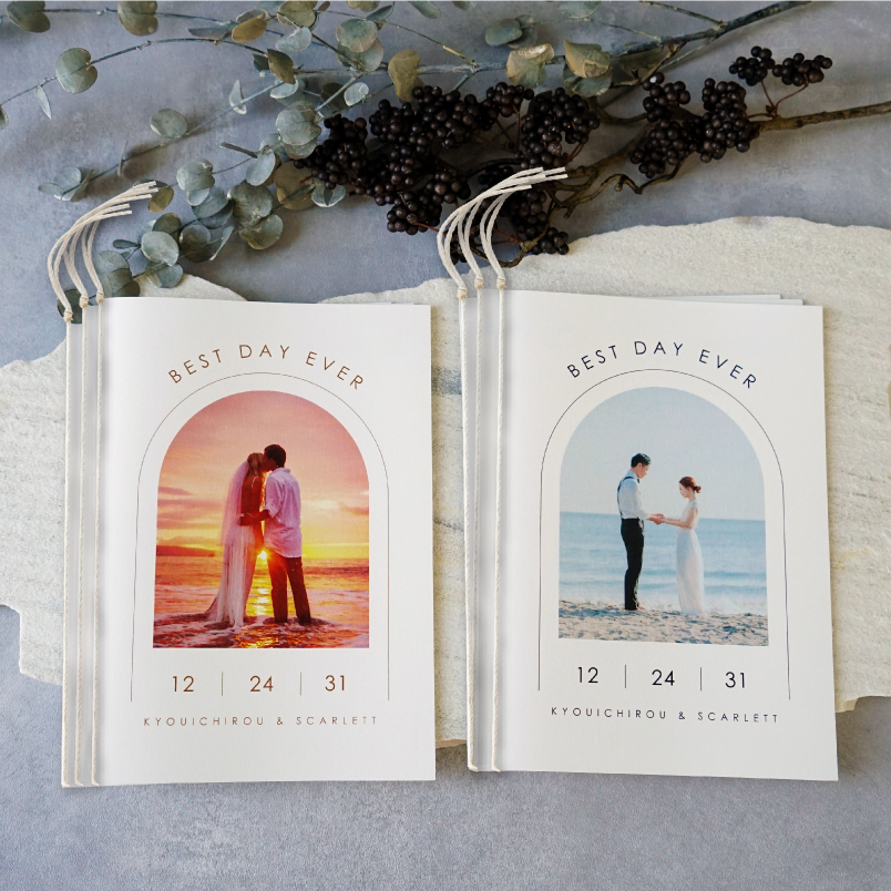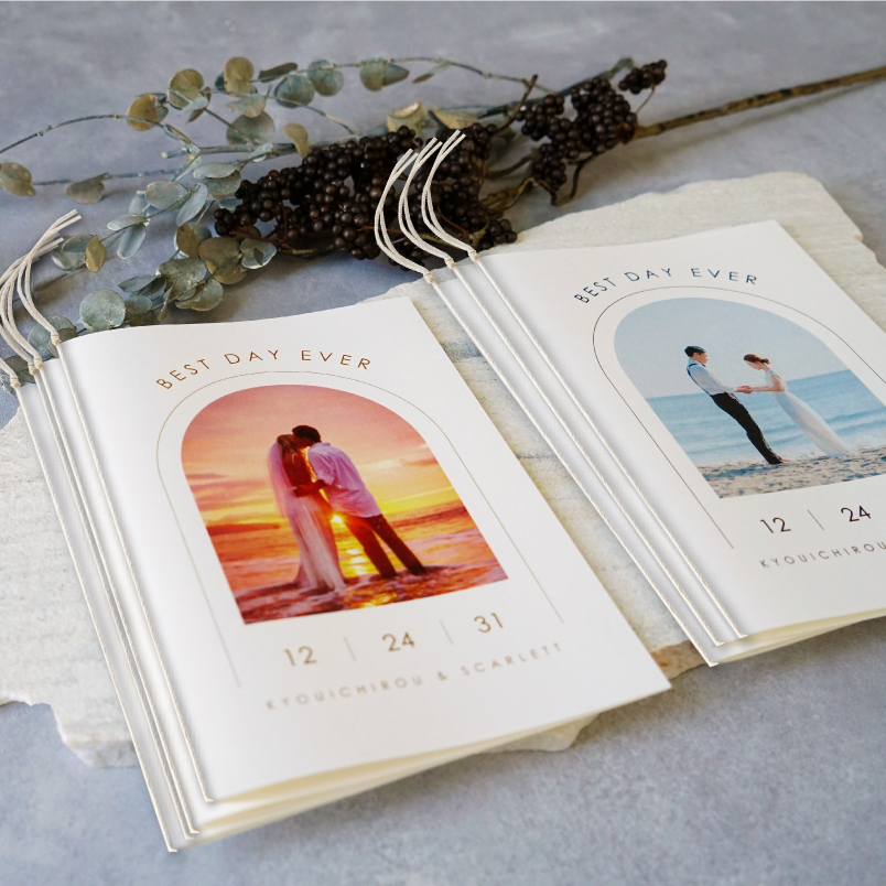 席次表には本日のプログラムや席のご案内を載せて、プロフィールブックにはおふたりのプロフィールをたくさんの写真とともに載せて使い分けるのもオススメです。